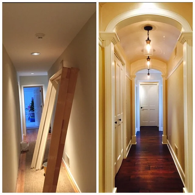 Before and after. New barrel vaulted ceilings, custom arches and trim.